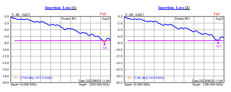 我們以ph0.5-51p-300lvds排線來說明。0.5x51x300xA兩面不貼復(fù)合鋁箔,測試結(jié)果如下圖(一),0.5x51x300xA單面貼復(fù)合鋁箔,測試結(jié)果如下圖(二)。